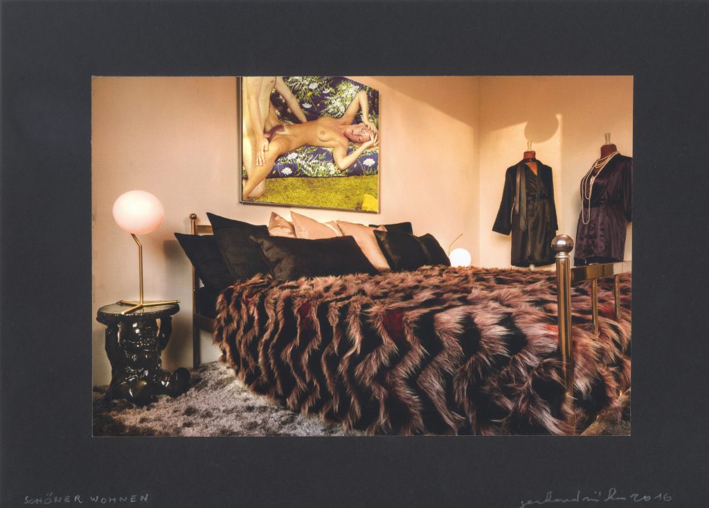 In kritischer und sarkastischer Auseinandersetzung verarbeitet Gerhard Rühm diese inszenierte Identität in einer Serie von Collagen unter dem Titel “schöner wohnen”. In den 60er Jahre begonnen und in den neuesten Arbeiten fortgeführt, eröffnet sich dem Betrachter bei genauem Hinsehen eine Persiflage zum schöner Wohnen. An die Stelle der Bilder, die üblicherweise an der Wand hängen, fügt er bewusst überblendend provokante Fotos ein.