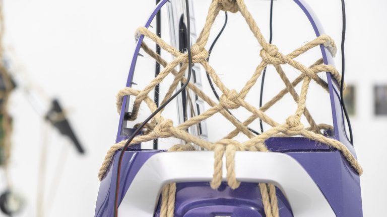 In den Arbeiten der Ausstellung, die formal ein dialektischer Aufbau bestehend aus je zwei Grundelementen verbindet, dekodiert Johannes Büttner scheinbar isolierte Phänomene. Ihren Inhalten, ihrer Vermittlung und ihren ambivalenten Verwendungen näherte ich mich in den letzten Wochen durch Skypetelefonate mit dem Künstler. Für mich steht im Zentrum des Netzwerkes von Artefakten die weiterentwickelte „Vacuum“ Serie. Wie vielfach innerhalb seiner Produktionsprozesse, arbeitet der Künstler auch hier mit einer außerhalb der Kunstwelt agierenden Person, deren Schaffen eigenständige ästhetische Erfahrungen und Wahrnehmungen zum Ziel hat, durch die Kooperation aber neue Zusammenhänge innerhalb der jeweiligen Arbeit entstehen lässt. Die Bondage Rigger Eileen Tan knotete in der Präzision ihres Handwerks dekonstruierte Staubsauger zusammen, die im Ausstellungsraum eine algorithmisch konstruierte Choreografie aufführen. Die verschlungenen, hängenden Körperhülsen der Geräte zucken in unterschiedlichen Intensitäten und verweisen über die Bondagekultur hinaus auf das Science-Fiction-Genre Cyberpunk, dessen Dichotomie zwischen organischem Körper (low-life) und artifizieller Aufrüstung (high-tec) in allen Arbeiten enthalten ist.