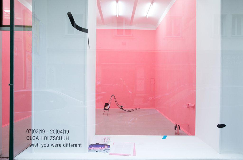 Ausgehend von den Veränderungen, die im Denken, Handeln und Fühlen unter Kontrollmechanismen entstehen, entwickelt Olga Holzschuh Zeichenanordnungen für das Nachdenken über Gegenwart und Zukunft. Diese Manifestation nimmt auch im digitalen Raum merklich zu. In fotografischen Arbeiten sowie in Videos, Objekten und Installationen werden Gesten und Posen verhandelt, die zwischen scheinbar unvereinbaren Gegensatzpaaren oszillieren: Macht(-losigkeit), Aktivität und Passivität, Schutz(-losigkeit), Gewalt(-freiheit), Fragilität und Stabilität. I wish you were different, der Titel der Schau, changiert zwischen Vorwurf, Drohung und vielleicht utopischen, melancholischem Wunsch. Er trägt eine dunkle Vorhersehung persönlicher Destabilisierung in sich, zeitgleich den Idealismus einer sentimentalen Bitte, und stellt die wesentliche Frage, ob jemand oder etwas in der Lage ist, sich grundlegend zu ändern.