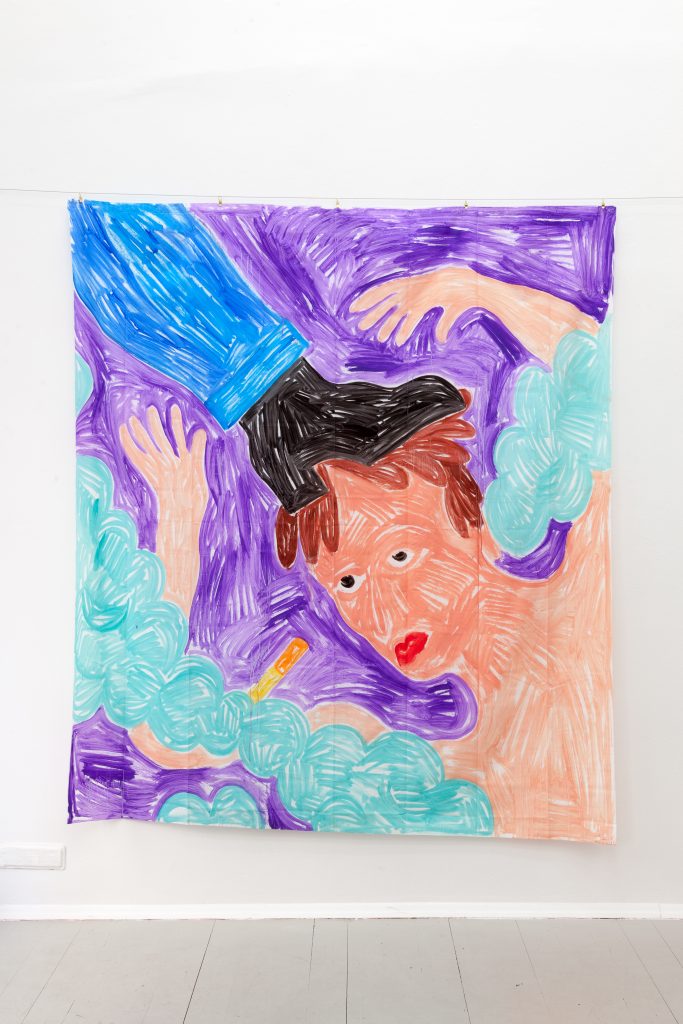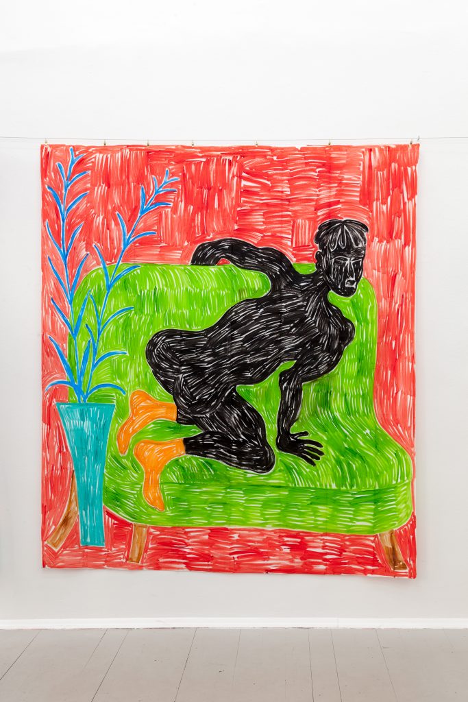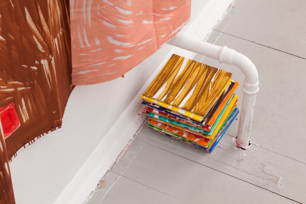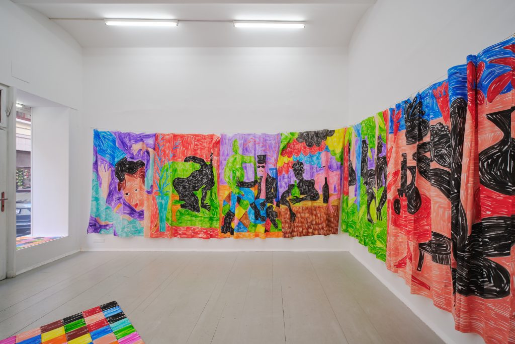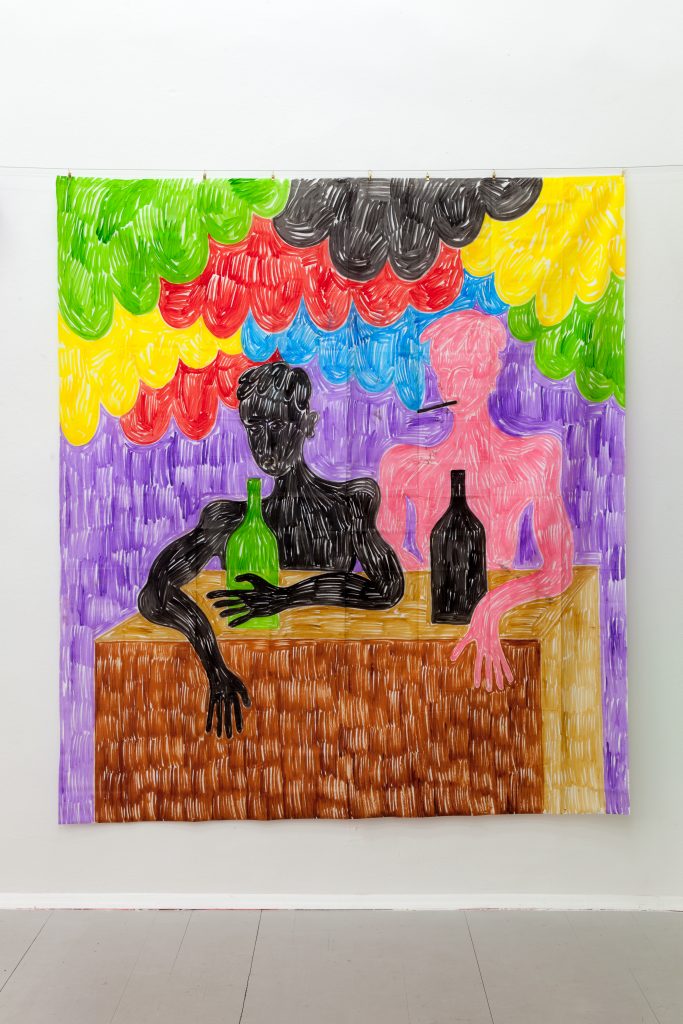 Der Duktus der in Öl gearbeiteten Bilder ist jedoch ein vollständig anderer als der seiner Vorgänger: als wären sie mit dickem Filzstift in rauer Art gekritzelt, flirren die intensiven Farben vor dem Auge. Die Zeichnung ist es dabei, die über die Malerei dominiert – in enger Wechselwirkung einander bedingend. Denn in der Betonung auf Zeichnung, die oft hinter der Malerei als Vorstudie zurücktritt, äußert der Künstler den Wunsch, ihren Stellenwert aufzubessern. Seine Arbeiten funktionieren entsprechend gleichsam in fluide gehaltenen Grenzen zwischen beiden. Leinwand und Polyethylen-Vinylacetat (kurz PEVA) dienen dem Öl gleichberechtigt als Untergrund. Die Arbeiten auf Kunststoff, aus dem handelsübliche Duschvorhänge gefertigt werden, sind in der Ausstellung für KOENIG2 überpräsent: Ein Dutzend bemalte Folien hängen von Stahlseilen. Durch ihre Raffungen verweigern sie dem Betrachter den gewohnten vollständigen und ruhigen Blick auf die Arbeiten. Die Inszenierung der Dichte an Farben, Formen und überlagernden Schichten steht im Vordergrund, ebenso der unwillkürliche Anflug von Ekel, bedenkt man die Gewohnheit des Materials, sich bei Nässe an den Körper des Duschenden anzuschmiegen. Diese haptische Qualität entbehrt ebenso wie die Auswahl und Platzierung der Arbeiten einem Narrativ, denn es fehlt der Praxis des Künstlers ausdrücklich jedes Gefühl von Geschichten und ihrer Erzählung. Dies wiederrum wird durch die abstrakt bemalten Kacheln verstärkt, deren Behandlung von Form lediglich in ihrem eigenen quadratischen Wesen enthalten ist.