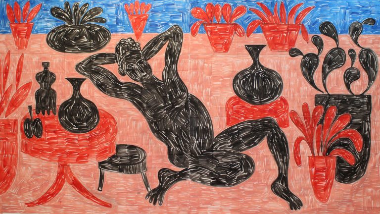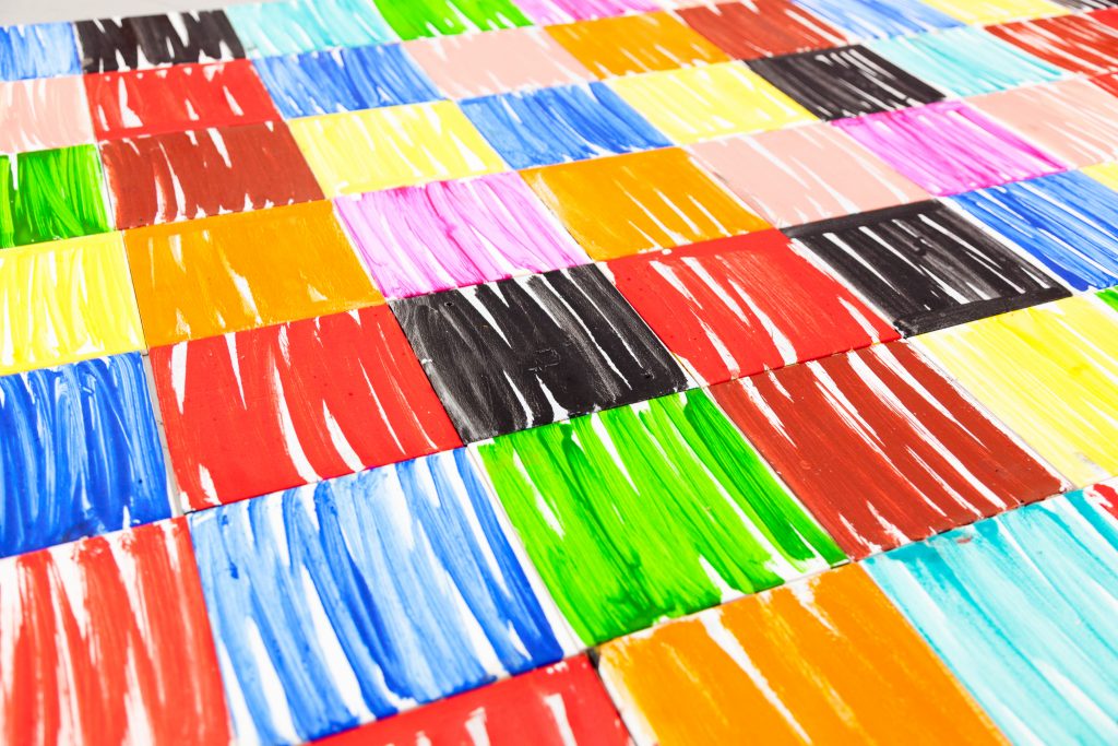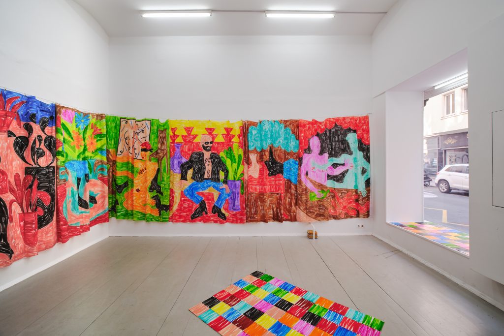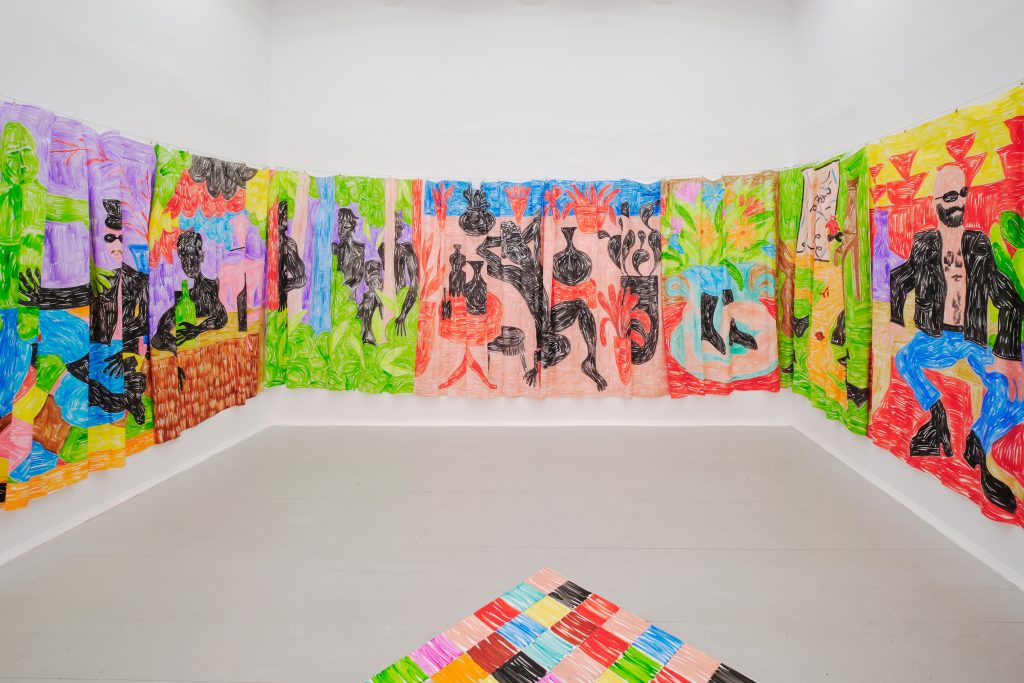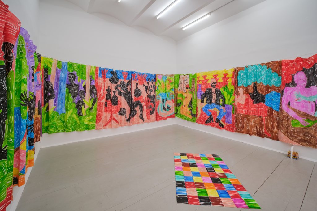 Der Duktus der in Öl gearbeiteten Bilder ist jedoch ein vollständig anderer als der seiner Vorgänger: als wären sie mit dickem Filzstift in rauer Art gekritzelt, flirren die intensiven Farben vor dem Auge. Die Zeichnung ist es dabei, die über die Malerei dominiert – in enger Wechselwirkung einander bedingend. Denn in der Betonung auf Zeichnung, die oft hinter der Malerei als Vorstudie zurücktritt, äußert der Künstler den Wunsch, ihren Stellenwert aufzubessern. Seine Arbeiten funktionieren entsprechend gleichsam in fluide gehaltenen Grenzen zwischen beiden. Leinwand und Polyethylen-Vinylacetat (kurz PEVA) dienen dem Öl gleichberechtigt als Untergrund. Die Arbeiten auf Kunststoff, aus dem handelsübliche Duschvorhänge gefertigt werden, sind in der Ausstellung für KOENIG2 überpräsent: Ein Dutzend bemalte Folien hängen von Stahlseilen. Durch ihre Raffungen verweigern sie dem Betrachter den gewohnten vollständigen und ruhigen Blick auf die Arbeiten. Die Inszenierung der Dichte an Farben, Formen und überlagernden Schichten steht im Vordergrund, ebenso der unwillkürliche Anflug von Ekel, bedenkt man die Gewohnheit des Materials, sich bei Nässe an den Körper des Duschenden anzuschmiegen. Diese haptische Qualität entbehrt ebenso wie die Auswahl und Platzierung der Arbeiten einem Narrativ, denn es fehlt der Praxis des Künstlers ausdrücklich jedes Gefühl von Geschichten und ihrer Erzählung. Dies wiederrum wird durch die abstrakt bemalten Kacheln verstärkt, deren Behandlung von Form lediglich in ihrem eigenen quadratischen Wesen enthalten ist.